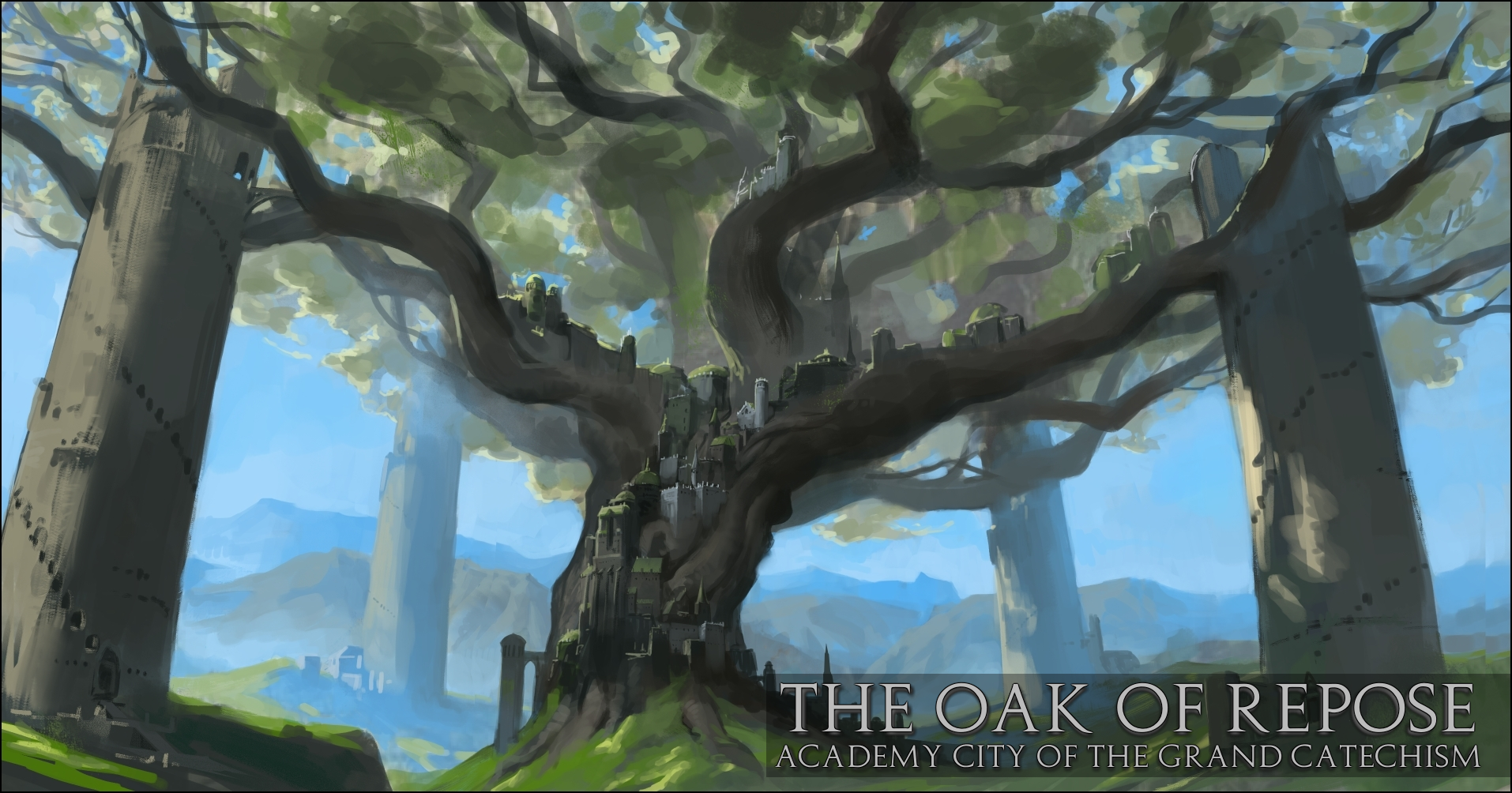 “The Oak of Repose, Academy City of the Grand Catechism. Seat of the Grand Magus and tens of thousands of catechumen, the ancient oak tree hosts an entire complex of universities, gardens, and is rumored to sit upon the furtive Kernel, the greatest collection of magical knowledge and artifacts known to the noble world.”